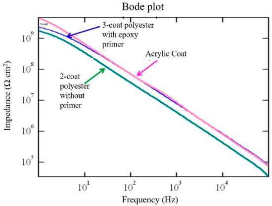 In general, the higher the impedance denotes higher corrosion resistance. Numerical fitting using the equivalent circuit was done first, and then the interpretation of EIS was carried out. The magnitude of the impedance signal gets increased at frequencies lower than 0.1 Hz; further, the phase angle becomes positive, and these data fall in the first quadrant of the Nyquist plot, as shown in Figure 9. These plots were fitted to the equivalent circuit, as shown in Figure 9. The acrylic paint ED coated specimens were exposed with a 3.5% NaCl test solution, offered the highest resistance of 2.50 × 109 Ω·cm2. Similarly, 2-coat polyester without primer and 3-coat polyester with epoxy primer coating specimens exhibited resistance of 1.35 × 109 and 1.00 × 109 Ω·cm2.