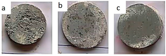 Surface macro-morphology images after salt spray test in 3.5% NaCl solution: (a) Acrylic paint ED coat; (b) 2-coat polyester without primer; (c) 3-coat polyester with epoxy primer.