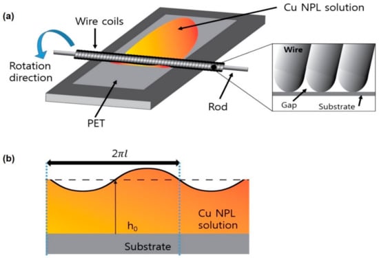 Schematic diagram of Meyer-rod coating process for Cu-plate solution. (a) Cu nanoplate (NPL) solution is coated with rotating rod at the ratio of 1:1 (rotation speed to coating speed) on polyethylene terephthalate (PET). The gap generated between wires determines coating thickness during leveling process. (b) Illustration of Cu NPL leveling process based mainly on surface tension and viscosity (wavelength of a sinusoidal disturbance and initial coating thickness are defined as 2πl and h0, respectively).
