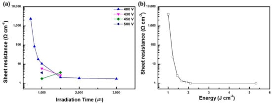 Electrical properties tests. (a) Sheet resistance at different applied voltage as a function of irradiation time. (b) Sheet resistance as a function of applied energy for threshold value.