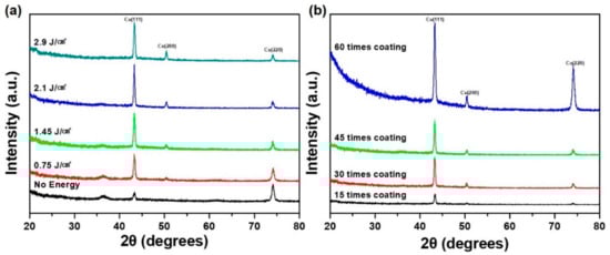X-ray diffraction spectra. (a) XRD pattern of Cu NPL with various irradiations. (b) XRD pattern of Cu NPL with various layers of coating.