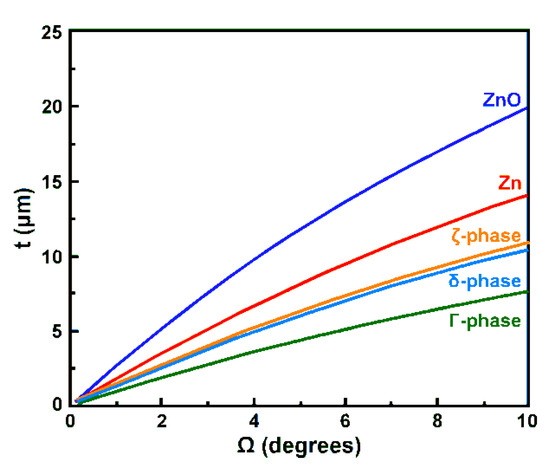 The penetration depth for GI-XRD geometry was also calculated for these phases, using again the diffraction angles corresponding to the highest intensity peaks of the diffraction pattern and Equation (6). Figure 2 shows the dependence of the penetration depth to the incidence angle for each Zn phase.