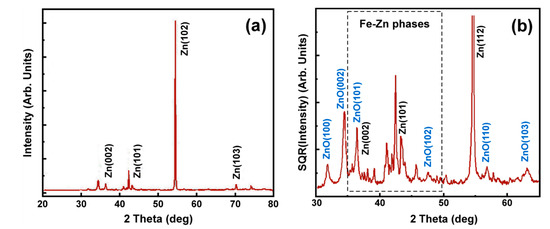 BB-XRD diffraction characterization of the hot-dip galvanized zinc coating confirmed the formation of several Zn compounds (Figure 3a,b). Diffraction peaks and Zn phases identification was accomplished using the following powder diffraction file (PDF) cards: 04-0831 (Zn), 65-3411 (ZnO), 45-1184 (delta phase), 65-1238 (zeta phase) [45]. Namely, various Zn phases were confirmed, such as phase eta, zeta and delta alongside the zinc oxide (ZnO). According to theory, the strongest peak should be that of Zn, which corresponds to the (101) reflection. However, the strongest intensity peak in the diffraction pattern of Figure 3 corresponds to (102) Zn peak, indicating a preferable growth orientation for the Zn crystals. This is attributed to the cooling rate following the immersion of the samples in the Zn liquid bath and the presence of Fe–Zn grains in the eta phase of the coating. These grains act as nucleation sites that favor the (102) growth direction instead of the (101).