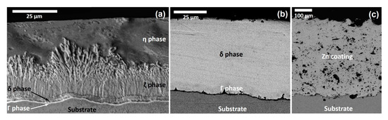 SEM micrograph of the cross section of the coatings deposited by hot-dip galvanizing (a), pack cementation (b) and thermal spray (c).