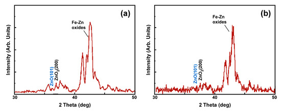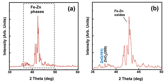 BB-XRD examination of the samples grown by pack cementation revealed the existence of ZnO and Fe–Zn phases (Figure 6). Considering the SEM images shown in Figure 4b, two different FeZn phases can be identified. The EDS analysis indicated a Fe concentration of 8–12 wt.% in the top thick layer and 20–25 wt.% in the thin layer placed above the substrate confirming the formation of delta and gamma phase, respectively. The presence of gamma phase in the interface with substrate has been reported previously [5,8,22]. However, as the thickness of the delta phase layer is larger than the corresponding X-rays penetration depth, the gamma phase could not be identified in the X-rays diffraction pattern. In contrast to the XRD pattern of the galvanized samples, no Zn peak could be identified, while low intensity ZnO peaks are also present (concentration lower than 3 wt.%). Furthermore, low intensity peaks corresponding to mixed Fe–Zn oxides were also present in the XRD pattern of Figure 6b. This is attributed to oxygen diffusion in the coating.