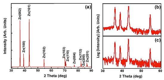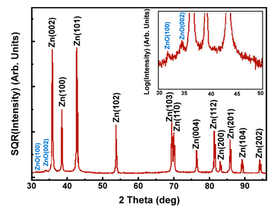 Figure 8a shows the BB-XRD pattern of the thermal sprayed Zn coating, indicating the presence of pure zinc. This is due to the fact that during thermal spray deposition, the diffusion processes are eliminated leading to confinement of the formation of Fe–Zn phases. This was also confirmed by the SEM image shown in Figure 4c. The GI-XRD diffractograms for both 5° and 1.5° were similar (Figure 8b,c). This is attributed to the characteristic rough surface morphology of such coatings [13,14,16]. It also important to mention that as the Zn diffraction peaks are very strong, low intensity peaks arising from very small concentrations of Zn compounds could not be identified in the pattern. To decrease the surface roughness, which is mainly responsible for the hide out of low intensity peaks, the thermal sprayed samples were mechanically polished. As a result, low intensity ZnO peaks were observed in the BB-XRD diffraction pattern of the polished samples (Figure 9). As reported previously [44], the oxidation of liquid metal droplets as they “flight” from the pistol flame to the substrate during deposition leads to the formation of ZnO oxides. Moreover, additional oxides were formed after the polishing process required to decrease the noise in the X-ray patterns as the Zn is very reactive and can oxidized immediately.