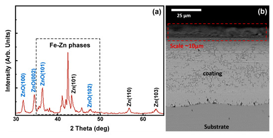 (a) GI-XRD pattern and (b) SEM micrograph of the oxidized hot-dip coating.