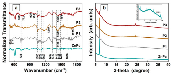 The thickness of the deposited layers was estimated using an Ambios Technology XP 100 profilometer (Santa Cruz, CA, USA). Three measurements were carried out for each sample, with the arithmetic media of the obtained values being considered the thickness of the layer as follows: 105 nm for ZnPc, 300 nm for P1, 180 nm for P2, and 285 nm for P3.