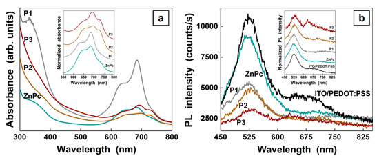 The UV-Vis spectra and PL spectra of the MAPLE-deposited thin films are shown in Figure 2a,b, respectively. The UV-Vis spectra of all the deposited films reveal, in the visible region of the solar spectrum, the typical absorption band of the phthalocyanines and the Q band with the Davydov split consisting of a main maximum at ~690 nm and a shoulder at ~640 nm [33]. As regards the weak shoulder which appears at about ~730 nm, this was evidenced in a recent study, being considered as a sub-band of the Q band, with its intensity increasing after an annealing treatment of the ZnPc films at ~150 °C [33]. The other characteristic absorption band of the phthalocyanines, the B (Soret) band peaking at ~360 nm, can be clearly identified in the UV-Vis spectrum of ZnPc, indicating the presence of monomers. The B and Q absorption bands are due to the π-π* transition having a dipole moment in the molecule plane [24,31,33]. In the case of the P1 sample, the absorption band peaking at ~335 nm is related to the presence of C60 [34]. Besides this, the addition of fullerene compounds induces the following modifications in the absorption of ZnPc: (i) the absorption shoulder peaking at ~640 nm linked to the dimers in phthalocyanines [31] is blue-shifted by the presence of C60 and red-shifted by the presence of PC70BM; (ii) the absorption shoulder peaking at ~730 nm is increased by the presence of PC70BM. Still, due to the ZnPc absorption, the specific bands peaking at ~380 and ~480 nm are associated with PC70BM [35], and those peaking at ~460, ~500, and ~550 nm [36], attributed to rubrene, are not observed in the UV-Vis spectra of the organic blends.