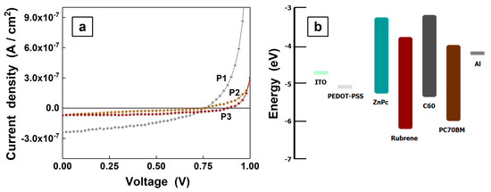 Thus, the P1 and P2 samples containing a mixture between ZnPc and C60 or ZnPc and PC70BM present a very small variation in the VOC value. Moreover, the P1 sample shows the highest JSC value (2.4 × 10−7 A). The result can be explained taking into account the following aspects: (i) the higher absorption of the layer containing C60, a larger quantity of light being absorbed in the active area leading to the highest value of JSC and (ii) the small difference between the LUMO orbitals of C60 and ZnPc (ΔE = 0.4 eV, ELUMO,C60 = 3.7 eV, ELUMO,ZnPc = 3.3 eV [21,42]) compared with those of PC70BM and ZnPc (ΔE = 0.7 eV, ELUMO,PC70BM = 4 eV [43]). Even if the P2 and P3 samples are characterized by the same JSC value, the addition of rubrene in the mixture containing ZnPc and PC70BM results in an increase in the VOC parameter from 0.74 V (P2 sample) at 0.88 V (P3 sample). A similar result was observed in the case of photovoltaic structures fabricated with other binary and ternary layers [18,19]. The increase in the VOC parameter is linked to a better energy alignment (cascade) between the organic compounds, with the HOMO level of the D2 lower than that of the D1; in our case, the HOMO orbitals of rubrene (EHOMO,rubrene = 5.4 eV [1]) and ZnPc (EHOMO,ZnPc = 5.2 eV [19]), respectively. Additionally, all the samples show similar values of Pmax.