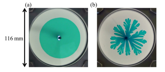 Fluid displacements for (a) a hydrodynamically stable condition of the interface, (b) a hydrodynamically unstable condition of the interface. The blue solution displaces the surrounding white solution. A more viscous solution is displacing a less viscous one in (a) while a less viscous solution is displacing a more viscous one in (b). The patterns like fingering in (b) are called “Saffman–Taylor instability” or “viscous fingering” (VF).