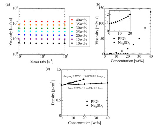 (a) Viscosity of PEG solutions against shear rate, (b) viscosity of PEG and Na2SO4 solutions against concentration, (inset) viscosity of Na2SO4 solutions against concentrations, (c) density of PEG and Na2SO4 solutions against concentrations.