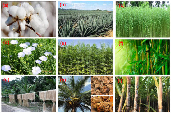 Natural fibre plants: (a) cotton; (b) sisal; (c) jute; (d) flax; (e) hemp; (f) bamboo; (g) banana; (h) coir; (i) sugar cane.