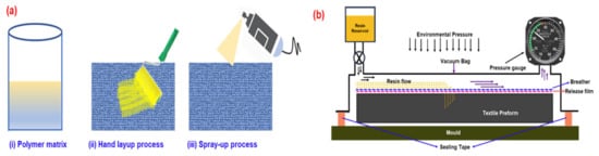 Composite moulding techniques. (a) Open moulding techniques: (i) polymer matrix; (ii) hand layup process; (iii) spray-up process (Reprinted with permission from []; Copyright 2018 Informa UK Limited). (b) Closed moulding technique: vacuum-assisted resin transfer moulding (VaRTM) (Reprinted with permission from []; Copyright 2012 Elsevier).