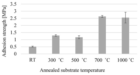 The adhesion strength of the cold-sprayed TiO2 coating on annealed SUS 304 stainless steel are shown in Figure 2. The TiO2 coating on the annealed hard substrates showed an increased trend of adhesion strength from room temperature to 1000 °C, with values from 0.51 to 2.55 MPa.