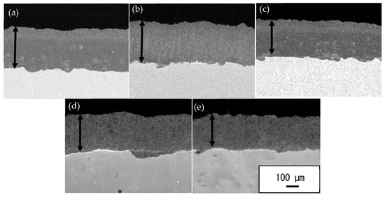 Figure 4a–e shows the TiO2 coating cross-sectional area on SUS 304 for various substrate annealing temperatures. The figures show, in all conditions, a dense coating with a thickness of 300 μm, indicating that a critical velocity was reached for this hard material. This suggests that the TiO2 coating adhered well to the annealed SUS 304 substrate from room temperature to 1000 °C annealing.