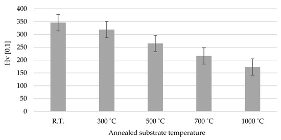 Annealed substrate microhardness of SUS 304 from room temperature to 1000 °C annealing.