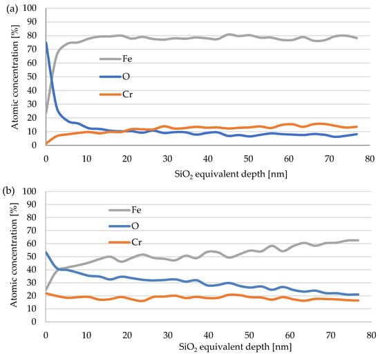 The result of the depth analysis of room temperature substrate and annealed 700 °C by X-ray photoelectron spectroscopy for the SUS 304 substrate is shown accordingly in Figure 6a,b. The atomic composition of oxygen in the deepest part of the oxide layer increases significantly as the annealing substrate temperature increases from RT to 700 °C. This shows that the oxide layer of stainless steel grows thicker as the annealing temperature of the substrate increases. We also expect the oxide layer to be thicker on the annealed 1000 °C SUS 304 substrate.