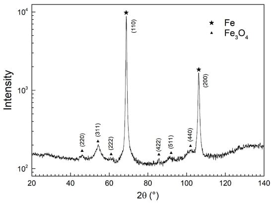 XRD phase analysis (Figure 1) showed that the “Fe” sample contained α-Fe and Fe3O4 phases. The reflections of α-Fe were located at (110) 68.842° 2θ and (200) 106.199° 2θ, respectively. The lattice constant was 2.8633(3) Å, which coincided with the tabular value for the α-Fe, which is 2.867 Å (JCPDS card No. 65-4899). The crystallite size was 20 nm, which was calculated using the Scherrer formula []. The reference intensity ratio (RIR) technique [] was applied for the semi-quantitative phase analysis. The reference standard was Corundum. The following tabular values were used for calculations: I/Ic (α-Fe) = 10.77, JCPDS card No. 65-4899, and I/Ic (Fe3O4) = 5.03, JCPDS card No. 75-33. The RIR calculations showed that the α-Fe content was 95 wt.%, and Fe3O4 was 5 wt.% (≈ 11 at.%). It is noteworthy that the typical uncertainty of the RIR method normally as big as 10%–20%, was even bigger in this particular case, since the diffraction was measured using Cr radiation, but the I/Ic tabular values were given for Cu radiation. XRD results showed no presence of crystalline forms of SiO2, for the Fe@SiO2 sample.