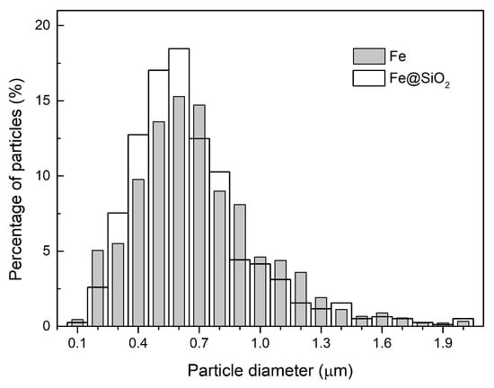 The particle size distribution for the “Fe” and “Fe@SiO2” samples is given in Figure 4. The size range was 0.1–2 μm, the maximum of the both distributions was at 0.6 μm. Individual SiO2 particles influenced the particle size distribution contributing to the region of 0.2–0.6 μm.