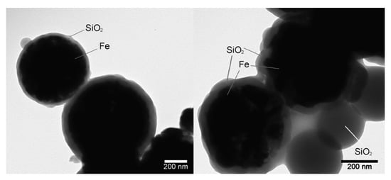 A very thin—sub-50 nm—shell was also observed in the SEM images of the “Fe@SiO2” sample (Figure 3). Local EDX analysis, which was measured from the “Fe@SiO2” sample, confirmed the presence of Si. The silicon to iron ratio was estimated at 15/85 at.%. Both the core-shell “Fe@SiO2” particles and individual SiO2 spheres presented in the powder, which was in accordance with reference []. The Fe particles have a porous structure (Figure 3b). After coating, the porous morphology of the iron particles can still be distinguished through a thin SiO2 layer (Figure 3c). Pure SiO2 particles appear as semi-transparent spheres, which is opposed to the complicated nano-structure of Fe@SiO2 particles.