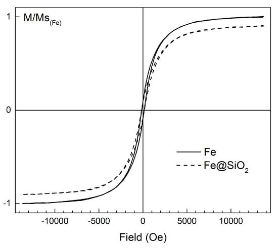 The saturation magnetization (MS) of the “Fe” and “Fe@SiO2” samples was 184 ± 9 emu/g and 157 ± 12 emu/g, respectively. The measurement results are presented in Figure 6.