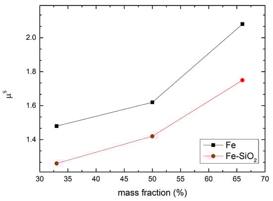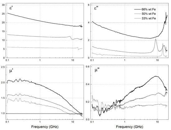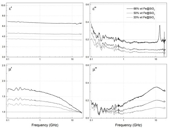 The microwave permeability (μ′ + i·μ″) and permittivity (ε′ + i·ε″) of the composites with a wax matrix and a filler mass fraction of 33, 50, and 66 wt.% were measured. The results are given in Figure 7 and Figure 8 for the “Fe” and “Fe@SiO2” samples, respectively. The complex microwave permeability of the composites was similar for both “Fe” and “Fe@SiO2” particles. The permeability of the composites with “Fe@SiO2” particles was lower by approximately 14% than composites with “Fe” particles (Figure 9, Table 1). This was due to the presence of the diamagnetic phase, SiO2.