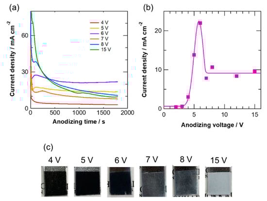 - Dark-colored anodic films were formed at voltages ≤6 V, where the steady-state current density increased with voltages. In contrast, the current density was almost independent of the anodizing voltage at ≥7 V, and colorless anodic films are developed.