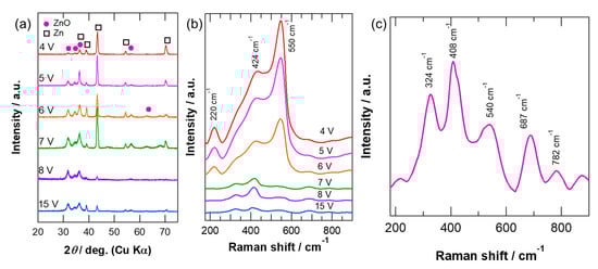 (a) X-ray diffraction (XRD) patterns and (b) Raman spectra of zinc anodized at different voltages in 0.1 mol·dm−3 KOH electrolyte at 20 °C for 30 min, and (c) enlarged Raman spectrum of zinc anodized at 15 V.