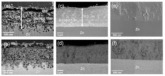(a,c,e) In-lens secondary electron (SE) and (b,d,f) backscattered electron (BSE) scanning electron micrographs of the cross-sections of the anodic films formed on zinc at (a,b) 4 V and (c–f) 15 V for 1800 s.