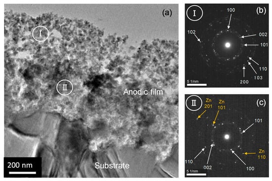 Further detailed structural and compositional characterizations were performed using TEM/EDS analysis. Figure 5a shows the transmission electron micrograph of an ultramicrotomed section of zinc anodized at 5 V. Indeed, a two-layer anodic film with an outer layer having higher porosity is developed on the zinc substrate. The thickness of the outer layer is approximately 300–400 nm, and the outer layer corresponds to the region above the dashed line shown in Figure 4a. The selected-area electron diffraction (SAED) pattern revealed the presence of wurtzite ZnO (Figure 5b), which is in agreement with the Raman spectroscopy and XRD results (Figure 2). No additional phase was resolved in this region. The thickness of the remaining inner layer of the anodic film was comparable to that of the outer layer. The SAED pattern of this region (Figure 5c) revealed the presence of a metallic zinc phase in addition to the wurtzite-type ZnO. Metallic zinc nanoparticles should be dispersed in the inner layer of the anodic film formed at 5 V, showing a metallic zinc phase in the SAED pattern. Figure S2 shows the transmission electron micrograph of an ultramicrotomed section of zinc anodized at 15 V for 300 s. The short anodizing time was selected for TEM observation because the sectioning of the anodic films as thick as ~6 μm is rather difficult by ultramicrotomy. An anodic film of ~1.5 μm thickness was developed with a flat metal/film interface. A crack penetrating the metal substrate was present in the anodic film, and this may have formed during the ultramicrotomed sectioning and not during the anodizing. The film appeared to be porous, and a higher-porosity region was found in its outer part, which was possibly formed by a dissolution–precipitation mechanism, i.e., dissolution of zinc as Zn(OH)42− species followed by its precipitation as ZnO [50]. Because of the higher growth efficiency at this anodizing voltage compared to that at 5 V, the remaining inner part of the film can be directly formed at the metal/film interface, as in the case of the anodizing of aluminum in acid electrolytes. The SAED pattern shown in the inset reveals that only wurtzite-type ZnO is present in the anodic film formed at 15 V. Similar SAED patterns were obtained for the other regions of the anodic film. No metallic zinc phase was present in the anodic film formed at this voltage.