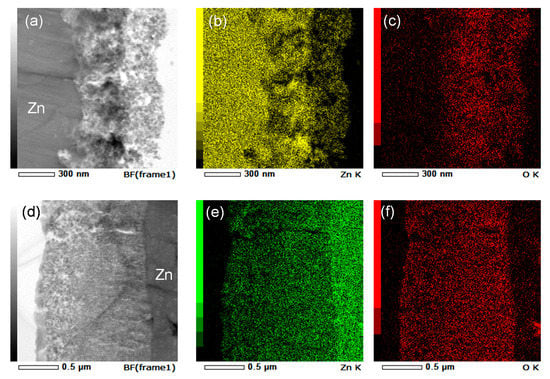 The compositions of the anodic films formed at 5 and 15 V were also examined by EDS. The scanning transmission electron micrograph of zinc anodized at 5 V is shown in Figure 6a, and the respective zinc and oxygen elemental maps are shown in Figure 6b,c, respectively. The intensities of both zinc and oxygen in the inner layer are higher than those in the outer layer, probably reflecting the higher porosity (lower density) of the outer layer. The distribution of zinc in the anodic film, particularly in the inner layer, was not uniform, and the high-intensity regions of zinc in the inner layer appeared dark, as shown in Figure 6a. Considering the distribution of oxygen in the inner layer, the intensity of oxygen did not clearly increase in the high-intensity regions of zinc. Thus, the different distributions of zinc and oxygen in the anodic film indicate that the zinc nanoparticles, probably those mainly located in the darker regions of the anodic film shown in Figure 6a, are dispersed in the ZnO-base anodic film. In contrast, similar distributions of zinc and oxygen are observed in the anodic films formed at 15 V (Figure 6d–f). The anodic film formed at 5 V contained the dispersed zinc nanoparticles; however, the nanoparticles were not present in the film formed at 15 V. Quantitative EDS point analysis of the regions shown in Figure S3 was also performed, and the oxygen content at each square region is shown in the figure. Compared to the oxygen content in the anodic film formed at 15 V, the oxygen content in the anodic film formed at 5 V was rather low, particularly in the regions with darker appearance. Even in the outer part of the anodic film formed at 5 V, the oxygen content is low compared to that at 15 V. Thus, zinc nanoparticles may also be present in the outer part of the film formed at 5 V.