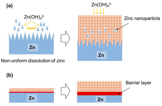Figure 7a shows a schematic illustration of the growth of the anodic film on zinc at voltages ≤6 V. At these anodizing voltages, non-uniform oxidation of zinc occurs, thus resulting in the roughening of the metal/film interface. A granular porous film may be formed by the dissolution of zinc as Zn(OH)42− species followed by the precipitation of ZnO [50]. The non-uniform oxidation of zinc induces the development of highly rough metal/film interface, causing the incorporation of zinc metal nanoparticles, probably at the convexity of the rough interface, into the anodic film without oxidation. In contrast, a barrier layer that can sustain a high electric field strength is formed between the metal substrate and the porous layer at voltages ≥7 V (Figure 7b), thus leading to a reduction in the current density to lower than that at 6 V, although the barrier layer was not directly observed by SEM and TEM. Because of the presence of the barrier layer, a flat metal/film interface was developed and the film-formation efficiency was significantly enhanced. Thus, a major part of the porous layer may be formed directly without the dissolution of zinc species. Only the outer part of the film with higher porosity is likely to be formed by the dissolution/precipitation mechanism.
