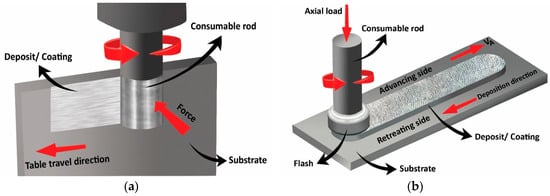 The possibility of producing metal deposition without any metal melting makes this technique distinct from other conventional methods of coating. Klopstock and Neelands introduced this technique as a metal-deposition process in 1941 [1]. In this method, the friction deposition is feasible due to frictional heat generated between the substrate and rotating consumable tool which makes this technique a powerful alternative for creating metal deposition [2]. There has been a developing interest in employing the friction surfacing process in recent years. Friction surfacing has many applications in welding, coating, repair of defective components, hard surfacing, and corrosion protection. This process does not generate high temperatures; therefore, this technique is a suitable method capable of coating low melting point alloys [2]. This technique could be used to create friction deposition over dissimilar materials [3,4,5,6,7,8]. Other advantages of this technique, such as a negligible amount of distortion in the rod and workpiece, low amount of residual stress, and removal of defects like porosities, are noticeable. The friction deposition process has a lower specific energy consumption and a higher rate of material transfer than laser cladding and plasma arc welding techniques. In the surfacing technique, using the end of the consumable tool, there is the possibility of enhancing the efficiency of the bonding up to 5%, by tilting the tool along the deposition direction. In addition, flash formation is another imperative issue which can result in material loss of about 40–60% of the total tool consumed [9].