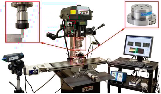 In this study, the friction deposition process was performed using a customized JET JMD-18 milling machine, as shown in Figure 2. Moreover, to improve the accuracy of the experimental testing results and provide a more precise and uniform longitudinal movement of the table, the manual feed handle attached to the table was removed, and the machine was equipped with a servo power feed. The transverse table movement of the JET JMD-18 milling machine was controlled manually. Real-time force measurement was made during the friction deposition process using a Kistler 9272 drilling dynamometer, data acquisition apparatus, and LabVIEW programming, as shown in Figure 2.