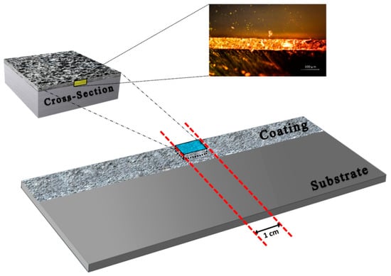 The coating thickness and material consumption rate were also measured. By evaluating the volume of rod material consumed in the process, the material consumption rate was determined for the experimental tests. A higher material consumption rate results in thicker deposits. The Leica DM2700 optical microscope (Leica Microsystems, Wetzlar, Germany) was utilized to evaluate the cross-sectional view and thickness of the deposits. In order to prepare the experimental samples for this evaluation, 1 cm of the coated samples was cut and mounted in epoxy, as presented in Figure 3, and then polished using 1 and 0.3 µm alpha-alumina abrasive particles, before viewing on the optical microscope.