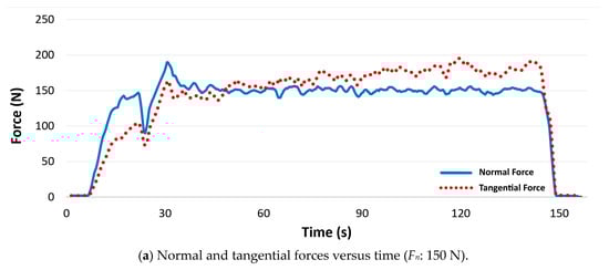 In this study, the friction deposition of the 6063 aluminum alloy consumable tool was made on AISI 1018 carbon steel plate as substrate. The friction surfacing process was performed using manually controlled forces of 150 and 250 N, as presented in Figure 4. The normal force and the tangential force are represented by Fn and Ft, respectively. The rotating consumable rod was forced in contact with the substrate for about a 50 s dwell period to achieve a higher temperature. This process is required to create initial deposition, before moving across the surface of the substrate.