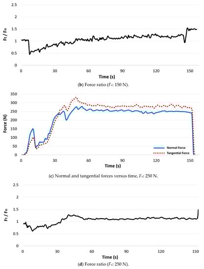 Manual controlling of the applied forces: (a,c) Normal and tangential forces versus time; (b,d) force ratio (Ft/Fn).