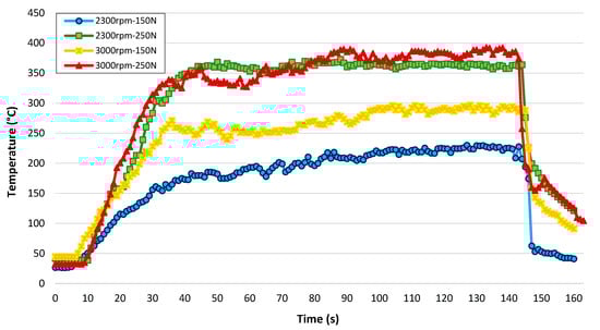 The maximum temperature profiles of the experiments are presented in Figure 6. The recorded values indicate that the process temperature converges to a steady state in all the experiments. Comparing all the temperature graphs reveals important information about the influence of process parameters. These graphs indicate that the applied force and the tool rotational speed have a significant effect on the process temperature. The temperature at the interface of the consumable tool and substrate rise and converge to its highest temperature in a steady state. By increasing the applied force from 150 to 250 N, the maximum temperature was raised from 230 to 373 °C, and from 296 to 392 °C, as the tool rotational speeds of 2300 and 3000 rpm were used, respectively.