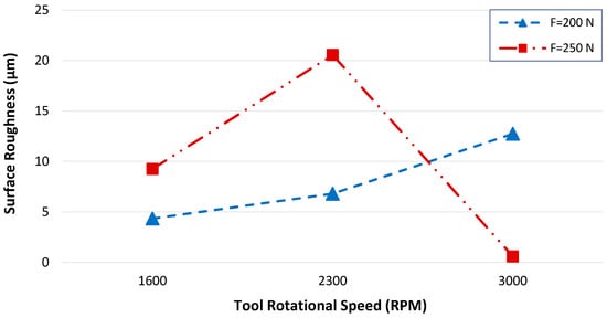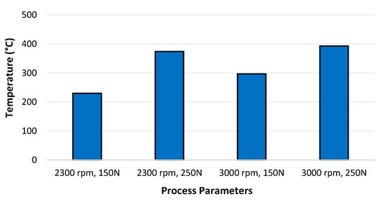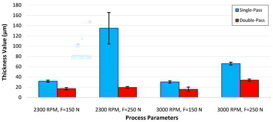 - A spike in surface roughness was found at process parameters of 2300 rpm, 250 N, and single-pass mode. Further experimental investigation of surface roughness for similar process parameters resulted in high surface roughness values, and it was found that the high roughness value recorded at process parameters of 2300 rpm and 250 N did not occur accidentally, and it had a root in the process temperature and material transfer process associated with it.