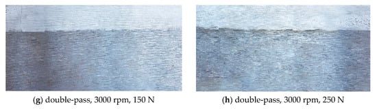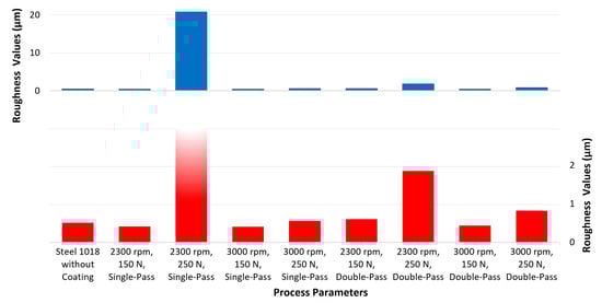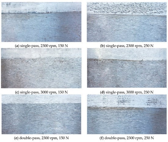 Figure 9 presents the influence of different process parameters on the surface roughness of depositions in the novel friction surfacing technique. As is shown in Figure 8, the visual assessment showed that applying a higher pressing force during the novel technique of friction surfacing provides a rougher surface. As the roughness measurement shows, the surface roughness was increased as the pressing force was raised from 150 to 250 N, in both single- and two-pass coatings. Furthermore, the results of the measurements reveal that tool rotational speed plays an important role in friction surfacing. This evaluation shows that increasing the tool rotational speed from 2300 to 3000 rpm mostly results in lower coating surface roughness values which means smoother deposition.