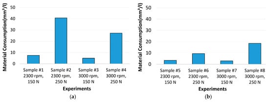 Friction surfacing using the side of the consumable tool is a great alternative technique to create super-thin coating layers in which the material consumption rate is very low. Figure 11a provides detailed information about the volume of tool material consumed per millimeter of coating width fabricated on the steel substrate during this process. It is seen that using higher applied force resulted in a significant increment in material consumption; however, increasing the tool rotational speed decreases the tool material consumption in single-pass deposition. Figure 11b reveals that by adding the second layer of deposition, a reverse material transfer process occurs, which means a portion of material from the first fabricated layer of the coating is transferred back to the rod. Therefore, by using even less material, better coverage was obtained through a dual-pass deposition process.