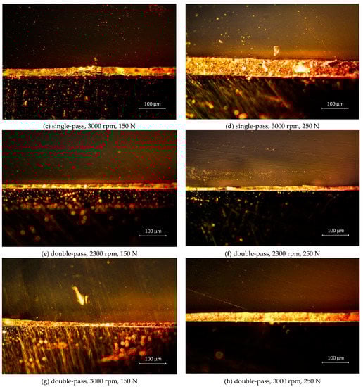 The fabrication of 6063 aluminum alloy from the side of the consumable tool onto carbon steel under different sets of process parameters is presented in Figure 8. As presented in Table 3, the experiments were carried out in two approaches of single- and double-pass deposition using two different applied forces of 150 and 250 N, and two different tool rotational speeds of 2300 and 3000 rpm. The aluminum coating is the white layer located in the top half of each sample’s photo. The initial visual assessment indicates that this technique is capable of providing an ultra-thin coating with a great level of coverage. The first layer of friction depositions exhibits good coverage, however, adding the second layer of deposition further improves the coating coverage slightly. Moreover, the visual assessment indicates that using higher values of pressing force creates a rougher coating.