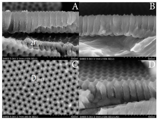 SEM micrographs of porous anodic aluminium oxide (pAAO): (A,B)—cross sections; (C)—top view; (D)—tilted view.