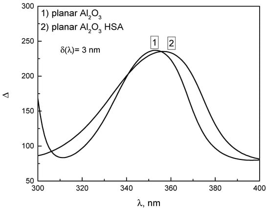 Simulated data of ellipsometric parameter Δ for: (1) Al2O3 (1st peak) at 353 nm and (2) Al2O3/HSA (2nd peak) at 356 nm.
