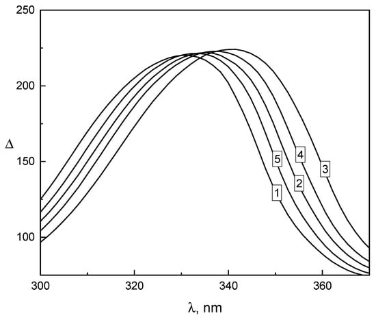 HSA adsorption to pAAO was evaluated by assessment of “Δ spectral shift” and regression analysis, which are presented in Figure 4 and Figure 5. Here, we present only the spectra of ellipsometric parameter Δ zoomed from λ = 300 to λ = 370 nm, because in this range, a clear shift of the Δ peak is observed. The determined shift of peaks’ wavelength is compared to shifts of the peaks in simulated spectra for the Al2O3 layer, presented in Figure 2. Starting with pAAO/air, the peak of ellipsometric parameter Δ is observed at λ = 330 nm (Figure 4, curve 1). After 1 h of incubation in solution containing 1 mg/mL of HSA, ellipsometric parameter Δ shifted towards longer wavelengths, resulting in the appearance of the peak at λ = 335 nm (Figure 4, curve 2); after 2 h of incubation in solution containing 1 mg/mL of HSA, the peak shifted even more significantly and appeared at λ = 341 nm (Figure 4, curve 3). After 3 h incubation in HSA solution and 15 min washing with PBS solution, a shift of ellipsometric parameter Δ to a shorter wavelength was observed at λ = 336 nm and it indicated that part of the HSA molecules had desorbed from the pAAO surface (Figure 4, curve 4). Finally, after washing with deionised water lasting 30 min, the peak position shifted even more to shorter wavelengths and appeared at λ = 333 nm (Figure 4, curve 5).