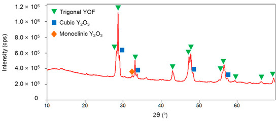 Figure 4 shows the XRD peaks of the YOF coating. The major peaks indicated by the reverse triangles in Figure 4 represent the crystalline structure of trigonal YOF. The minor peaks indicated by squares and rhombuses represent, respectively, the crystalline phases of cubic and monoclinic Y2O3. Although cubic and monoclinic Y2O3 are unwanted phases, their formation was unavoidable to a certain extent. A possible scenario for the formation of Y2O3 would be as follows. First, Y5O4F7 particles in suspension would be transformed into YOF particles, while Y5O4F7 particles volatilize in the form of YF3 in the plasma jet region [19]. Then, some of the YOF would be transformed into Y2O3, while the YOF is mainly volatilized in the form of YF3 by sufficient heat energy in the plasma jet region [20]. The detailed mechanism is explained in our previous paper [11].