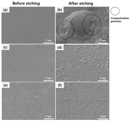 Figure 5 shows the FE-SEM images of the surface microstructure of the Al2O3 bulk, Y2O3 coating, and YOF coating before and after exposure to the CHF3/Ar plasma for 60 min. The Al2O3, Y2O3 coating, and YOF coating were polished to less than 0.1 µm of roughness, respectively. Furthermore, as shown in Figure 5a,c,e, they had a smooth surface before plasma exposure. After exposure to the fluorocarbon plasma, the erosion on the surface of the Al2O3 bulk was much more severe than that of the Y2O3 coating and the YOF coating. As shown in Figure 5b, large and small crater-like erosion sites were generated and contamination particles, which are shown as tiny dots in the figure, were observed on the Al2O3 surface after exposure to fluorocarbon plasma. As shown in Figure 5d, although the Y2O3 coating showed much less erosion than the Al2O3 bulk, it had more cavities and deeper erosion than the YOF coating.