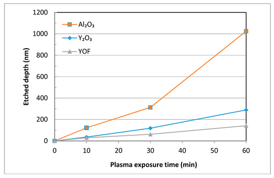 Figure 6 shows the etched depth of the Al2O3, Y2O3, and YOF surfaces with the plasma exposure time. The etched depth was measured in nine areas of their surfaces and the average value was calculated. The etched depth of the Al2O3 surface steeply increased after 30 min in comparison with that of the Y2O3 and YOF surfaces and became more than 1025 nm after 60 min. As plasma etching progressed, crater-like erosion sites were formed. Once they were formed, the erosion seemed to be accelerated, spreading from the erosion sites as shown in Figure 6. On the other hand, the etched depths of the Y2O3 and YOF surfaces were, respectively, 289 and 142 nm after 60 min of plasma exposure and increased almost linearly with the plasma exposure time. Considering that the Al2O3, Y2O3, and YOF surfaces were equally bombarded by ions of Ar plasma in the presence of highly corrosive fluorocarbon [13], the difference in the etched depth of the three samples in Figure 6 means that the YOF coating is more resistant to the CHF3 plasma than the Y2O3 coating, which is more resistant than the Al2O3 bulk.