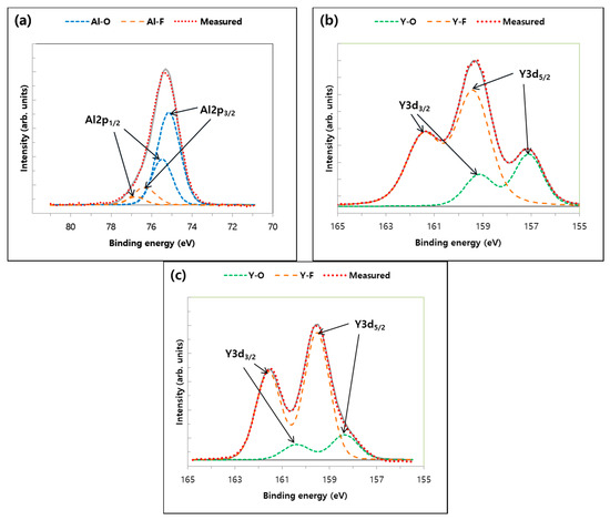 In Figure 7c of the YOF coating, the peaks at the lower binding energies of Y3d5/2 and Y3d3/2 at 158.35 and 160.40 eV correspond to the Y–O bonding, and those peaks at the higher binding energies of Y3d5/2 and Y3d3/2 at 159.55 and 161.60 eV correspond to the Y–F bonding. Fluorination was also confirmed at the peak of F1s located at 685.1 eV in the XPS spectrum of fluorine bonding. The peak position of the YOF coating was changed less than those of the Al2O3 bulk and Y2O3 coating after the plasma etching. The shift of the peaks of fluorine bonding to higher binding energy than those of oxygen bonding was attributed to the replacement of oxygen atoms by fluorine atoms around the cations during the etching process [26]. Fluorine bonding being stronger than oxygen bonding comes from the higher electronegativity of fluorine—3.98 as compared to 3.44 for oxygen [26].